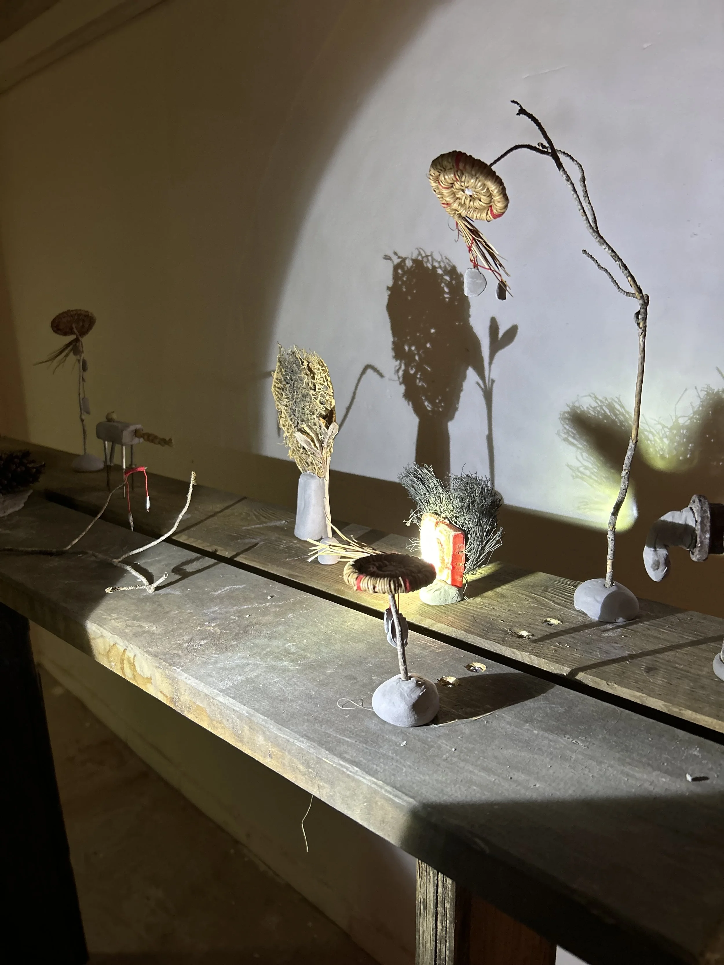 את האובייקטים יצרנו מחומרים אהובים שאנו אוספות לאורך שנים, במהלך שיטוטים בנופים אורבניים או בטבע. חלודה וחומר, מחטי אורן וחוטי כותנה, פשטות ומורכבות, תכנון, משחק ואלתור. חופש מסוים וחדוות יצירה מהוססת בזמנים מורכבים.
